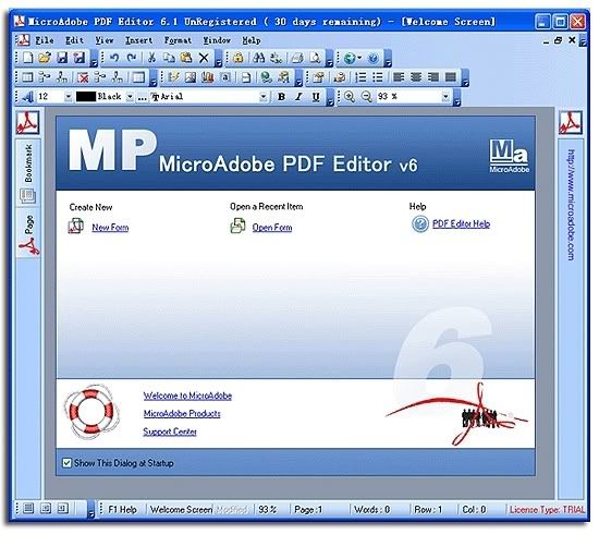 MicroAdobe PDF Editor is a professional software for editing PDF. You can create and edit PDF file just like operating Mircosoft Office Word. It supports BookMark and page browser and allows you to import word(.doc), Html, Rtf file.